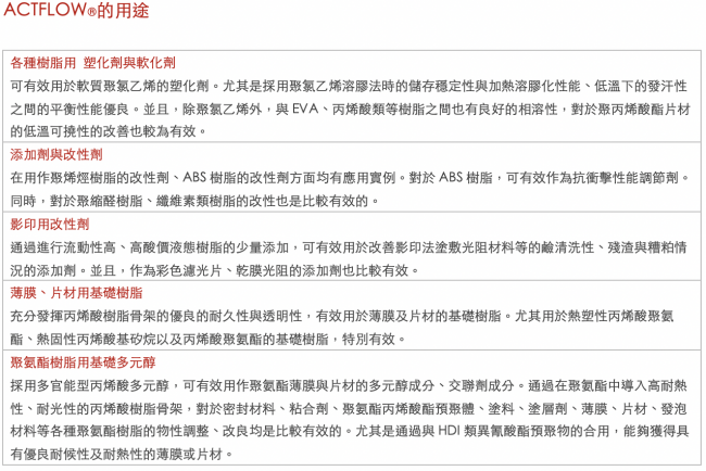 - 建議將ACTFLOW?作為改善利用影印法塗敷光阻材料時(shí)的鹼清洗性以及改善殘?jiān)?、糟粕情況的添加劑。並且,在彩色濾光片、乾膜光阻的添加劑以及聚烯烴、ABS、聚縮醛、纖維素類樹脂的改性劑方面也有應(yīng)用實(shí)例。