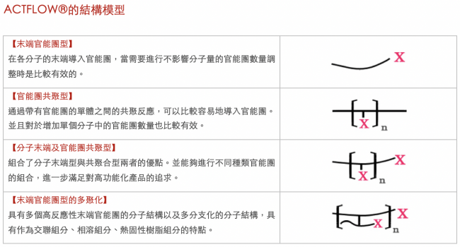 ACTFLOW™除具備原有的高透明性外,還可以通過對(duì)組成、官能團(tuán)種類與數(shù)量的控制,添加到軟質(zhì)調(diào)整產(chǎn)品及光學(xué)樹脂產(chǎn)品中, 是一種追求交聯(lián)度、柔軟度的液態(tài)丙烯酸聚合物。
