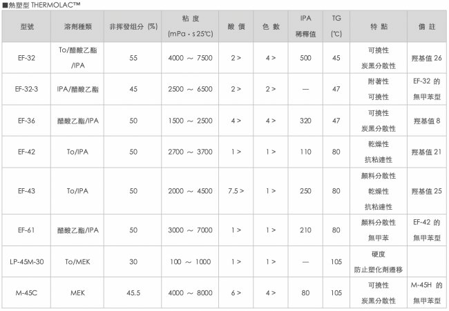 | EF-61 | 醋酸乙酯/IPA | 50 | 3000 ~ 7000 | 1 > | 1 > | 210 | 80 | 顏料分散性 無(wú)甲苯 |